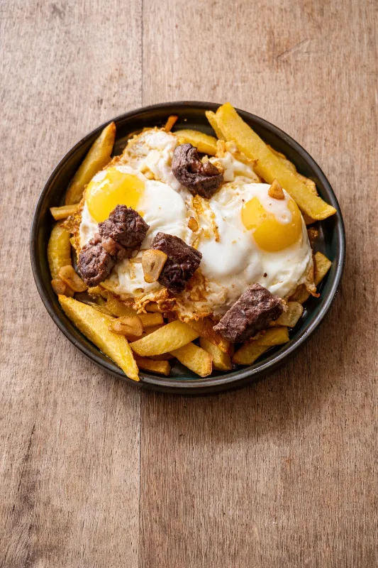 Eggs with beef tenderloin sautéed in garlic