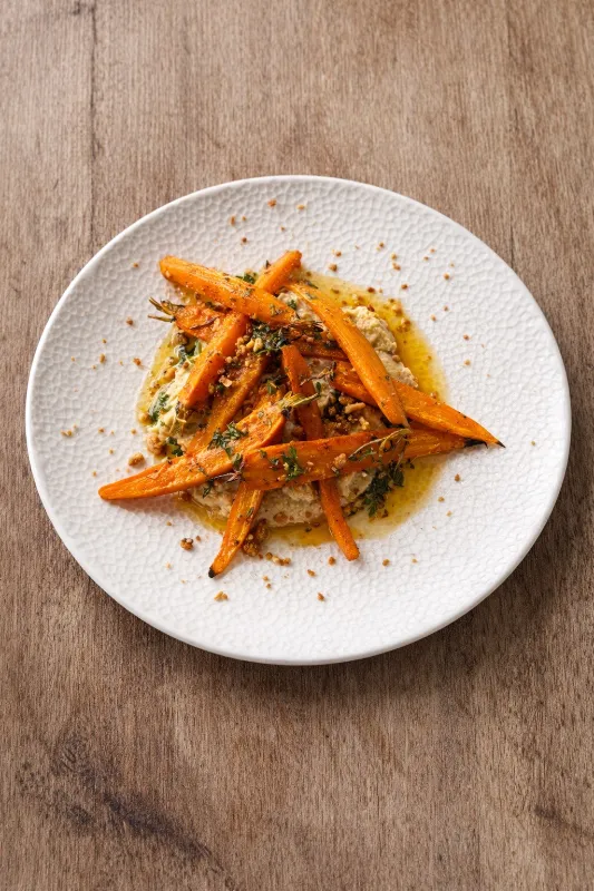 Braised bunch carrot with hummus, "romesco migas" and hazelnuts Reus PDO